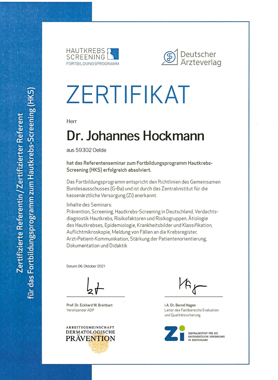 Berechtigung zur Durchführung von Fortbildungsseminaren für Dermatologen & Hausärzte, die sich an der Früherkennungsuntersuchung auf Hautkrebs beteiligen